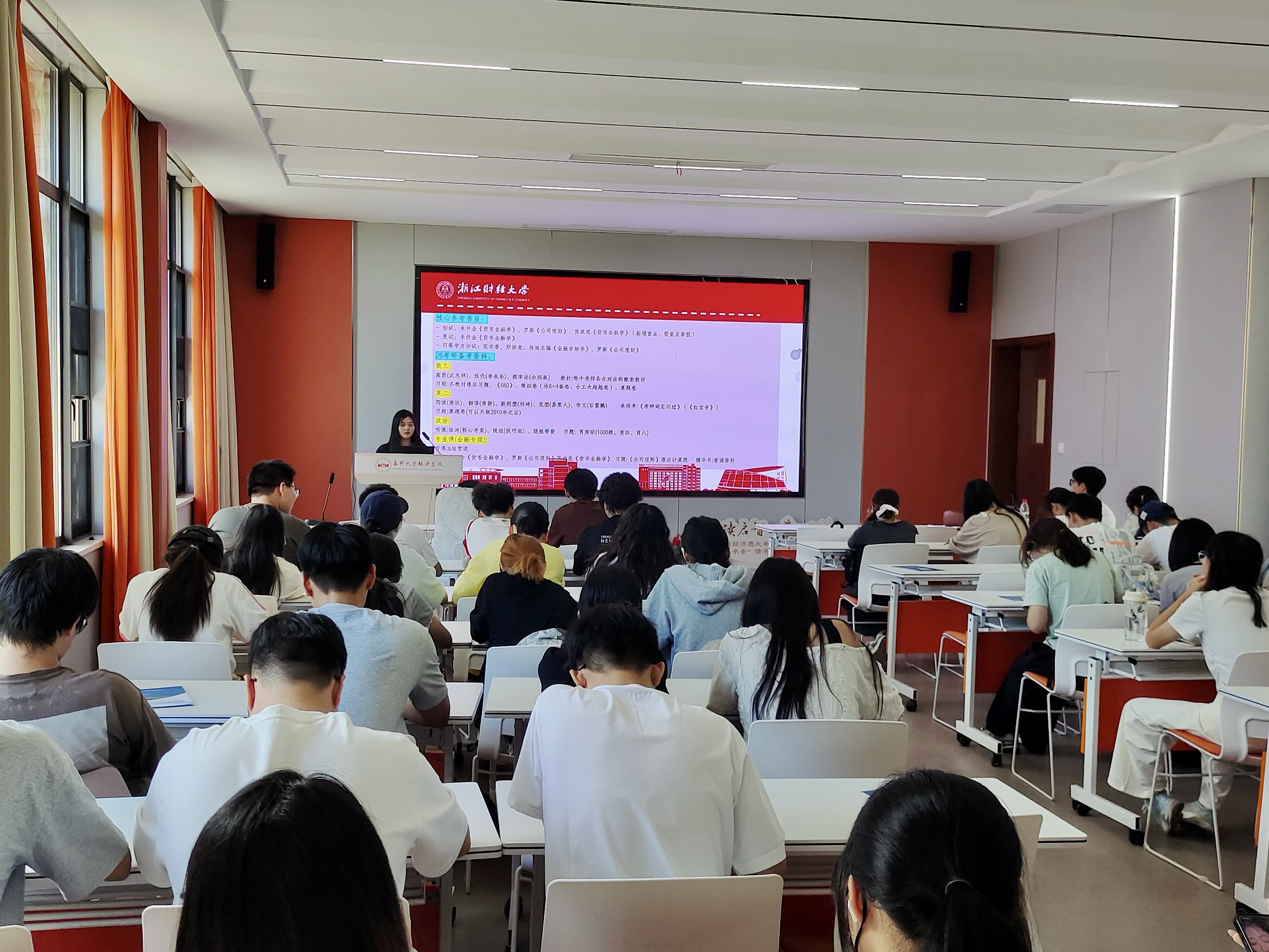 宣讲会上,团队成员们分发了学院精心准备的《浙江财经大学金融学院2026年硕士研究生招生宣传册》,介绍了学院的发展历程、师资队伍、学科建设成果以及奖助学金政策,并围绕金融学、金融和保险三个硕士招生专业,详细解读了培养方向、课程特色与招生人数,展示了学院雄厚的师资力量与科研平台,以及研究生在科研创新与高层次升学就业方面的突出表现。宣讲队员们还分享了校园生活环境、餐饮住宿条件、交通便利性和各类文化实践活动,还结合自身经验,针对备考计划、专业课复习、复试准备、推免流程等具体问题作出了细致解答。