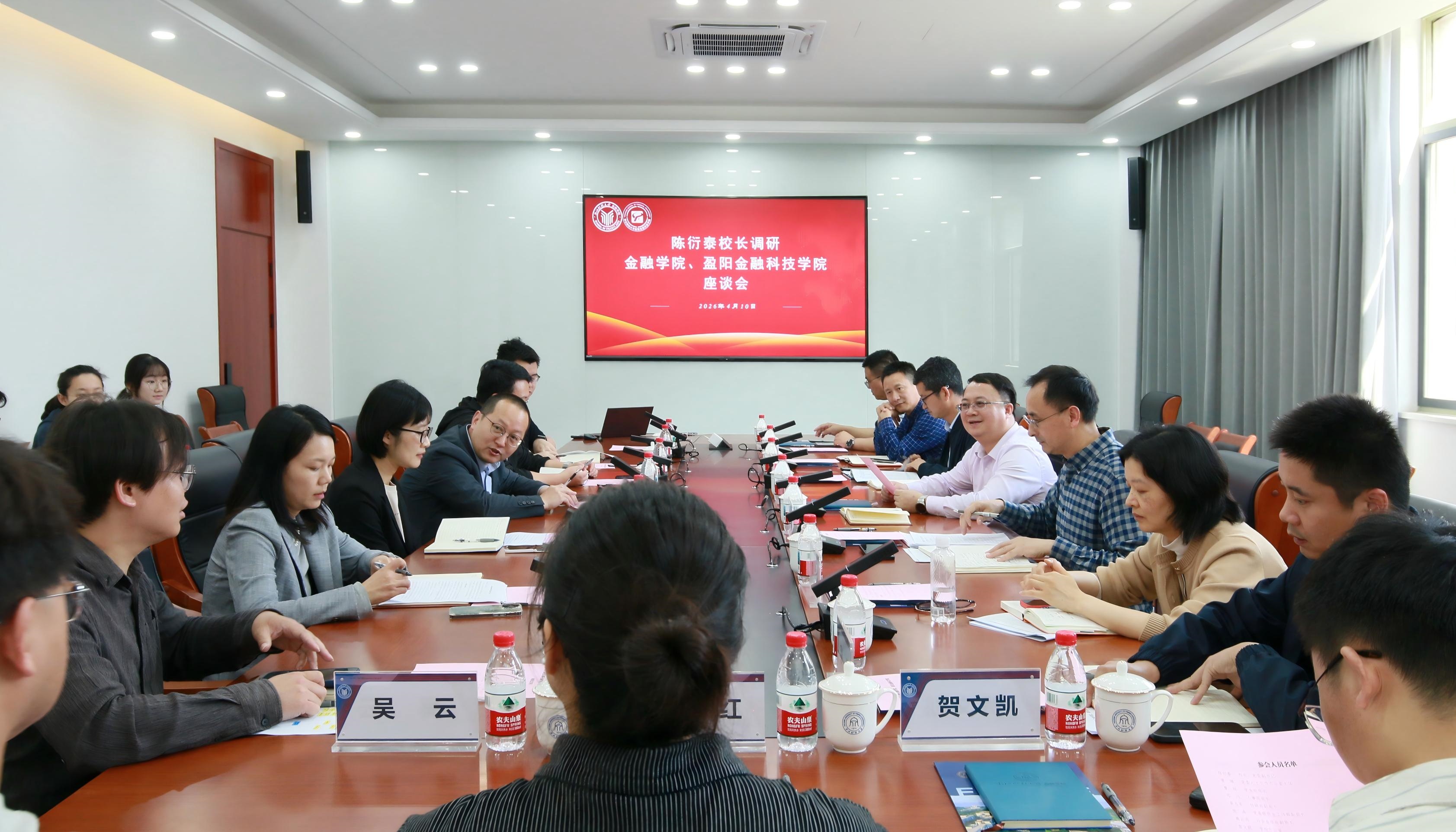 2026年4月10日下午,校长、党委副书记陈衍泰赴金融学院、盈阳金融科技学院调研指导。学校办公室、人才工作办公室、学生处、人事处、科研处、研究生院、社会合作处等职能部门负责人,以及金融学院、盈阳金融科技学院领导班子成员和师生代表参加座谈。会议由金融学院党委书记朱旭明主持。