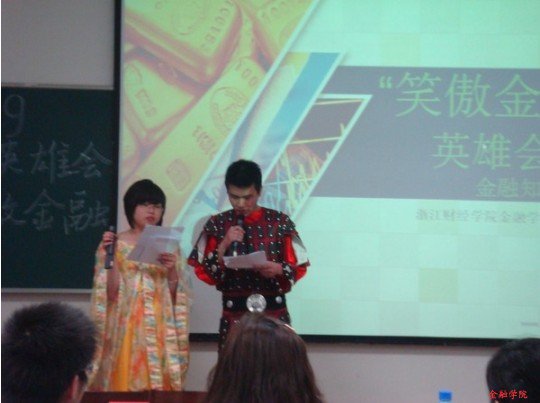 4月10日(周五)晚6:00,在金融学院202教室,展开了这场浩浩荡荡的群雄争霸赛。在主持人简短的介绍后,六派英雄早已摩拳擦掌,迫不及待地想要展露身手。这场金融决斗总共有五个回合,分别为连环飞刀、灵犀一指、乾坤大挪移、见招拆招、决战紫禁之巅。通过五轮较量考察了各派英雄对金融知识的掌握,为这场决斗增加了一些娱乐性,让前来观看的百姓更加融入这场比赛,笑声连连。