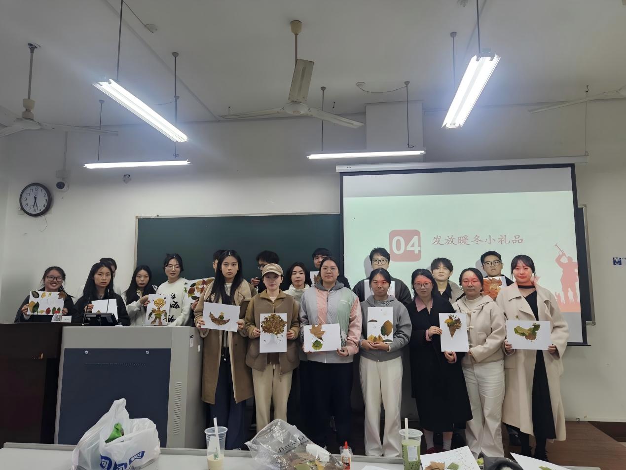 为深化党建引领作用,创新党性教育实践载体,推动红色基因与实践育人深度融合,2025 年 11 月 22 日下午,研究生第一、三、五党支部在学院楼 104 会议室联合举办 “一叶知秋映初心,巧手绘梦颂党恩” 红色主题党日活动。活动以自然树叶为创作媒介,将生态文明理念与红色党建主题紧密结合,通过预备党员接收仪式、红色树叶画创作、优秀作品评选表彰等环节,引导支部党员在动手实践中淬炼党性修养、凝聚奋进力量,以艺术之笔抒发爱党爱国情怀。