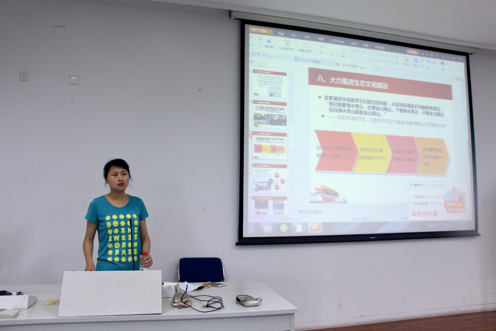 与此同时,辅导员尹怀玉老师于A201就深入阐释我国经济发展“新常态”展开讨论,为金融学子们带来了一节精彩的形势政策课。尹怀玉老师以中国经济四大困难为前提,提出了时下最新经济热词“新常态”,并且深刻地解释了“新常态”的当下含义和未来发展目标。此次授课能够帮助金融学子们更好地掌握时下的形势动态,使课本知识在实际中得到了良好的体现。